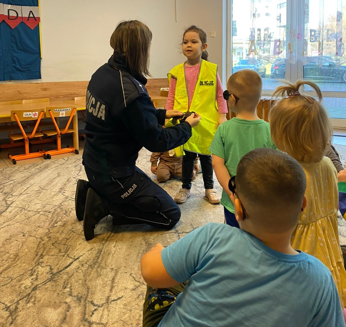 Podczas spotkania mł. asp. Marzena Sierocka przypomniała najmłodszym o numerze alarmowym, z którego należy korzystać w sytuacji zagrożenia. Dzieci dowiedziały się jak trzeba postępować w kontakcie z osobami obcymi oraz ćwiczyły właściwe przechodzenie przez jezdnię. Policjantka wyjaśniła też maluchom jak należy podróżować samochodem i jaką rolę pełnią pasy bezpieczeństwa oraz jak ważne są elementy odblaskowe dla pieszego.