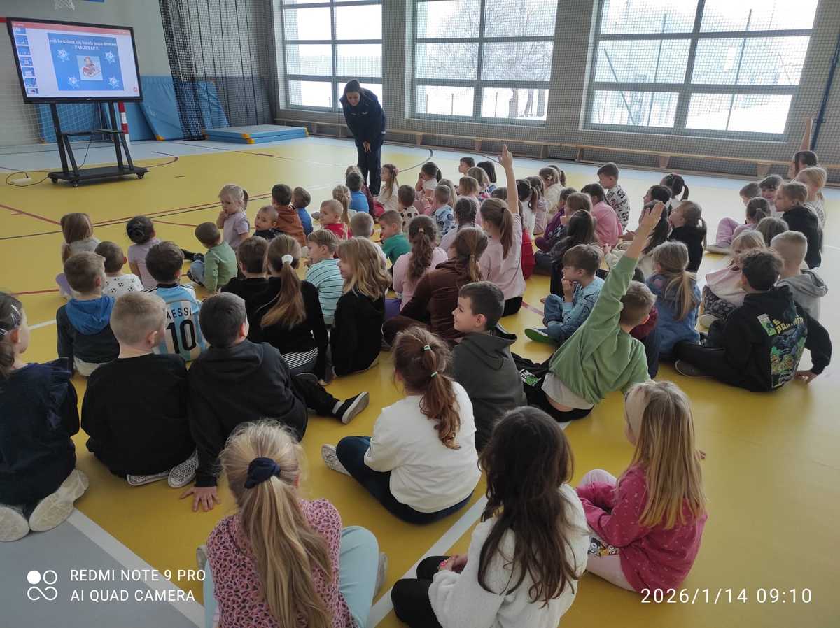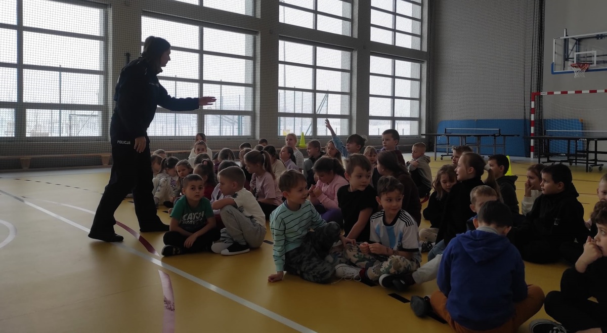 Mł. asp. Marzena Sierocka podczas wizyty w szkole przypomniała uczniom klas I-VIII o zagrożeniach mogących pojawić się w trakcie zimowych ferii. Profilaktyk społeczna omówiła zasady bezpieczeństwa podczas uprawiania sportów zimowych oraz gier i zabaw na świeżym powietrzu. Dzieci przypomniały sobie jak należy się zachować, jeśli będą świadkami zdarzeń, w których zagrożone jest ludzkie zdrowie i życie oraz pod jakie numery należy dzwonić, aby uzyskać szybka i fachową pomoc.