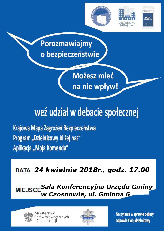 Komendant Nowodworskiej Policji oraz Komendant Komisariatu w Czosnowie zapraszają mieszkańców gminy Czosnów do udziału w debacie społecznej na temat bezpieczeństwa. Spotkanie odbędzie się 24 kwietnia br. o 17.00 w sali konferencyjnej Urzędu Gminy. Podczas debaty zostaną omówione problemy mieszkańców związane z lokalnymi zagrożeniami.